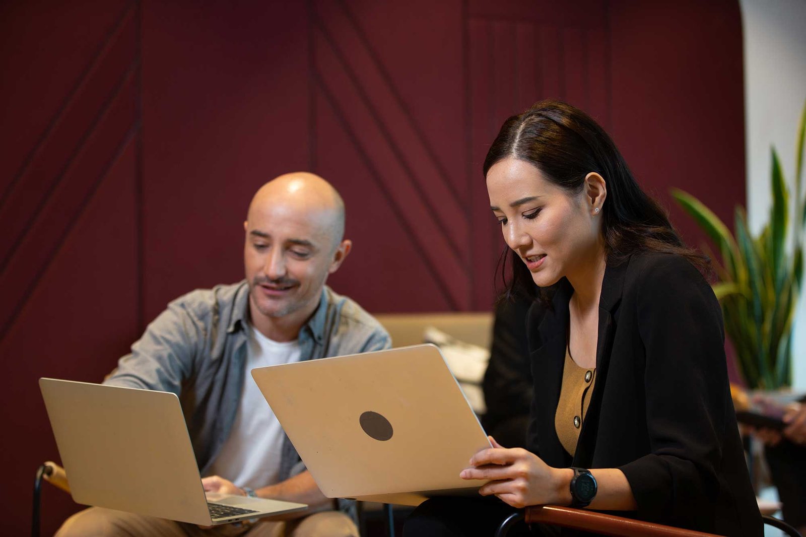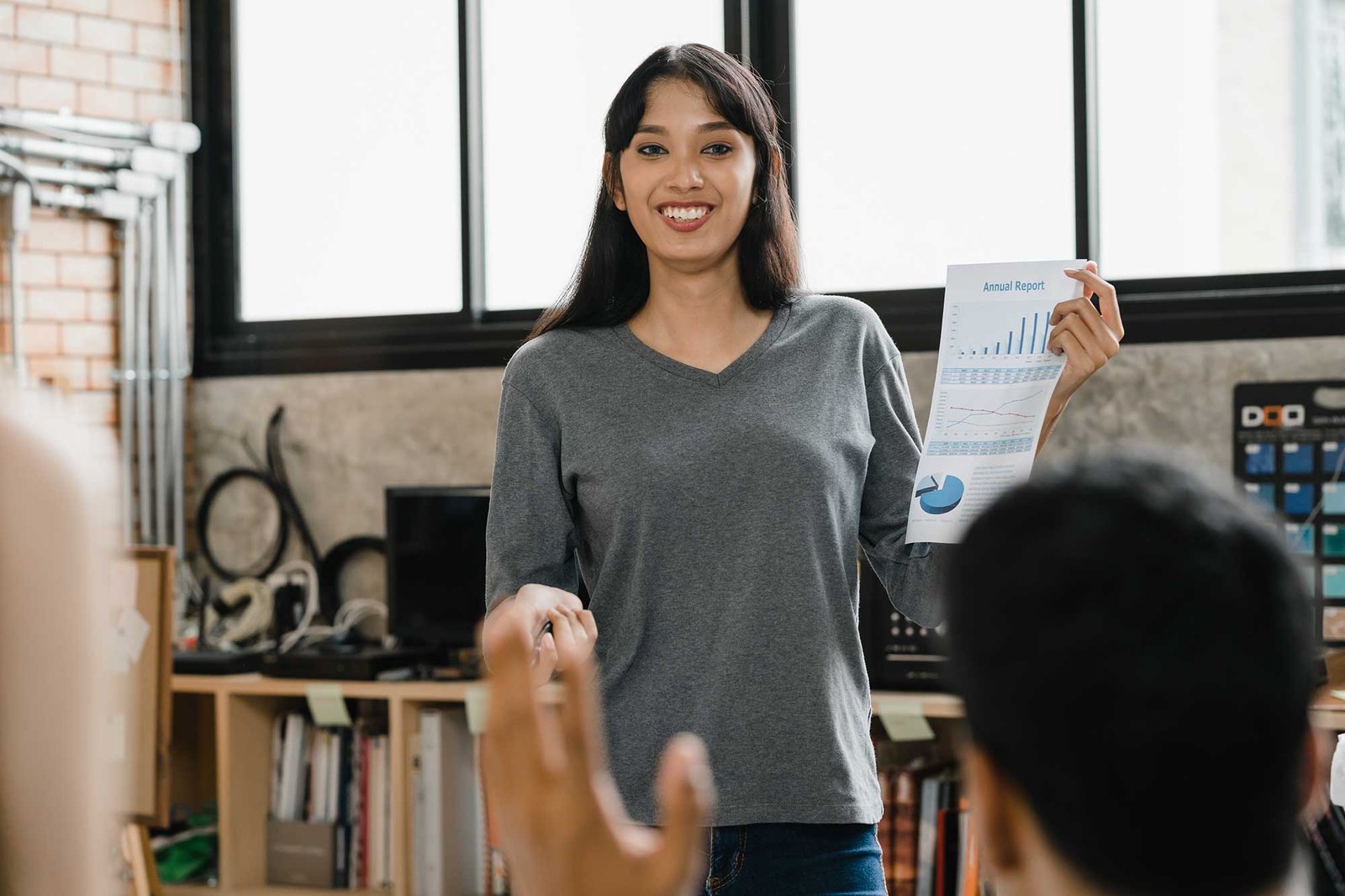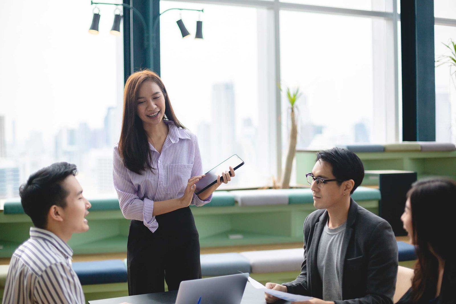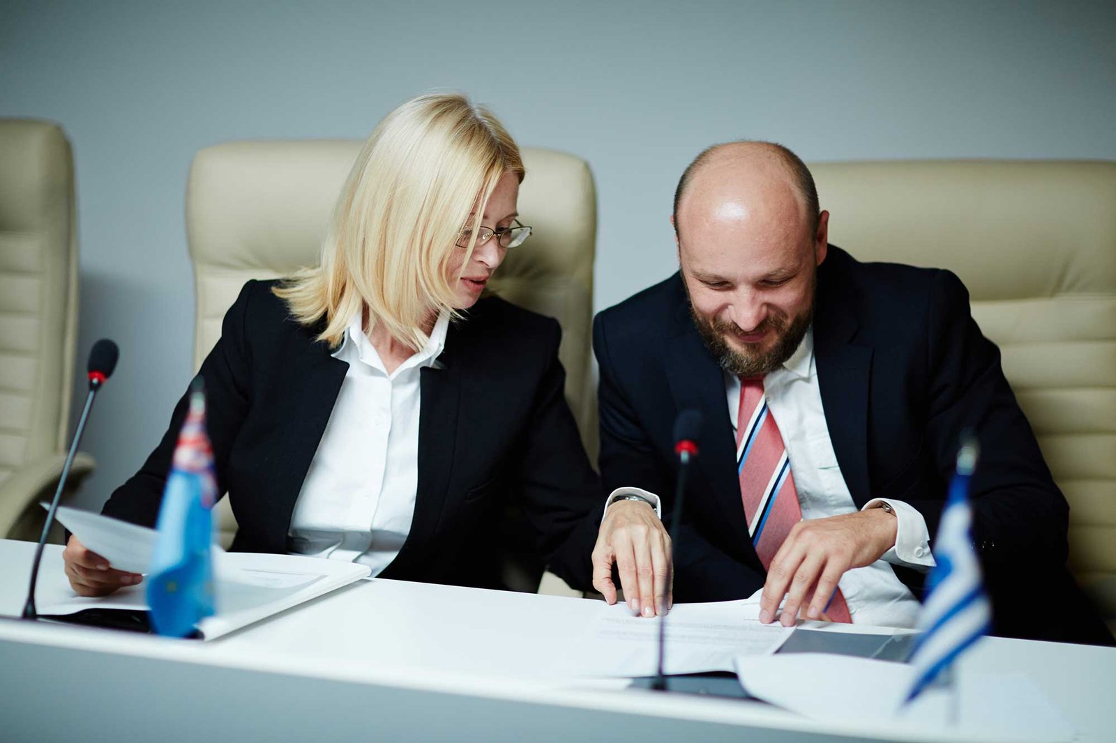 smiling interracial business people in formal wear looking at camera while waiting for job interview